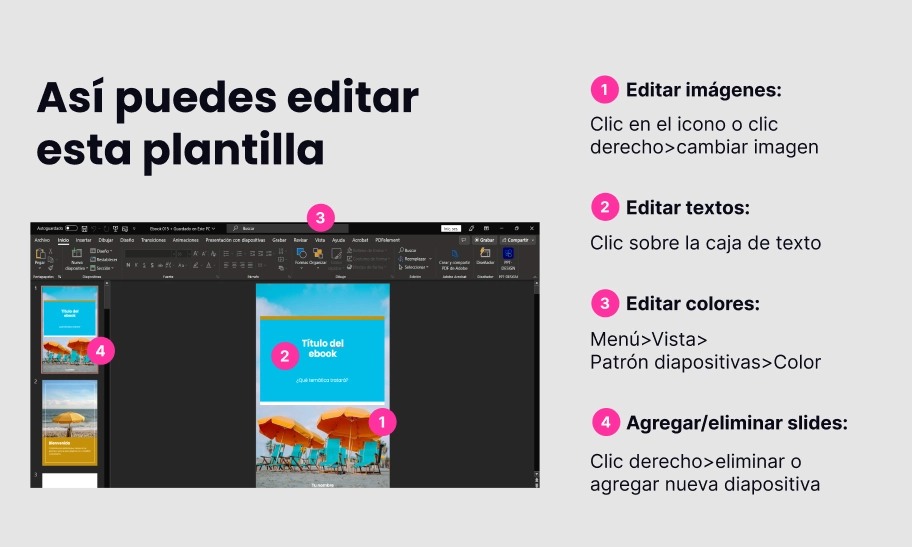 Las plantillas están diseñadas para ser editadas con herramientas simples y fáciles de usar, como Microsoft Powerpoint o Google Slides. Sigue las instrucciones proporcionadas en la descripción de la plantilla para personalizarla según tus necesidades.